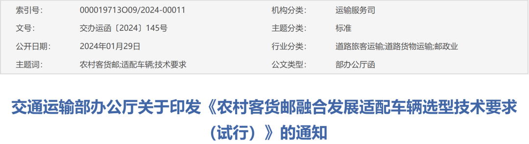 1ÔÂ29ÈÕ£¬½»Í¨ÔËÊä²¿ÍøÕ¾Ðû²¼¡°½»Í¨ÔËÊ䲿°ì¹«Ìü¹ØÓÚÓ¡·¢¡¶Å©´å¿Í»õÓÊÈÚºÏÉú³¤ÊÊÅä³µÁ¾Ñ¡Ðͼ¼ÊõÒªÇó£¨ÊÔÐУ©¡·µÄ֪ͨ¡±¡£
