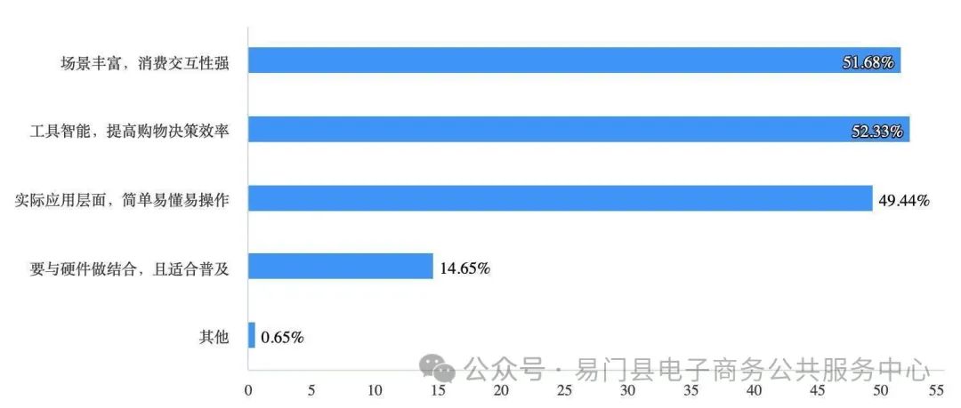 ÔÚ¶ÔÀíÏëÖеÄAIµçÉ̽øÐÐÃèÊöʱ£¬½»»¥ÐÔÇ¿¡¢³¡¾°¸»ºñ¡¢ÒײÙ×÷Êdz¬50%µÄµ÷Ñй¤¾ß×ö³öµÄÒ»ÖÂÑ¡Ôñ¡£ÁíÓÐ14.65%µÄµ÷Ñй¤¾ßÏ£ÍûAIµçÉ̹¤¾ßÔöÇ¿ÓëÓ²¼þµÄ½áºÏ£¬±ãÓÚÌá¸ßÆäÆÕ¼°¶È¡£